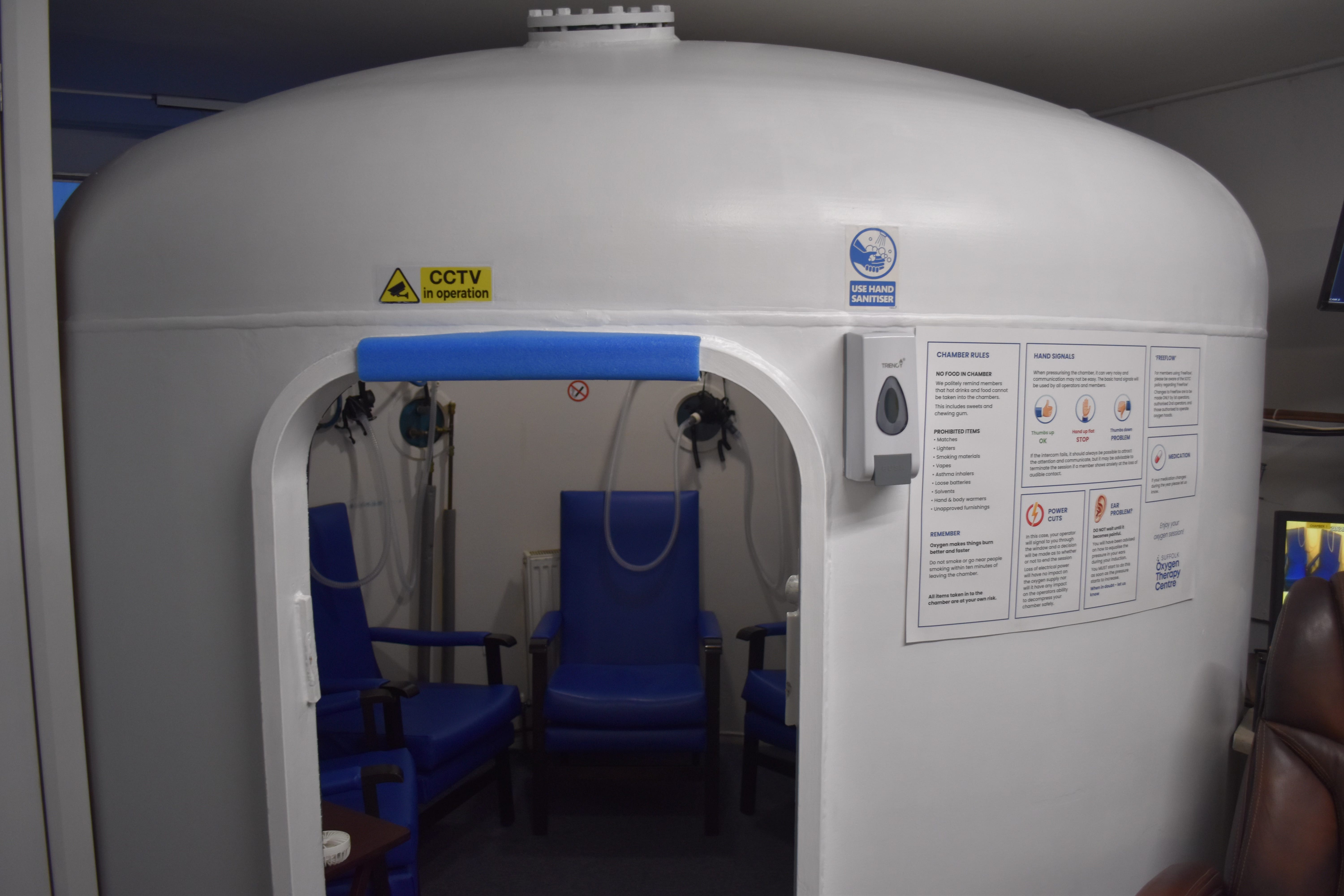 It’s small, round, and surprisingly human in scale. There are oxygen masks clipped neatly to the sides, space for around four people, and just enough room to sit comfortably without feeling cramped. As the big door is shut and the session begins, the sound of pressurised air fills the chamber. A steady whooshing that reminds you very quickly that something unusual is happening.